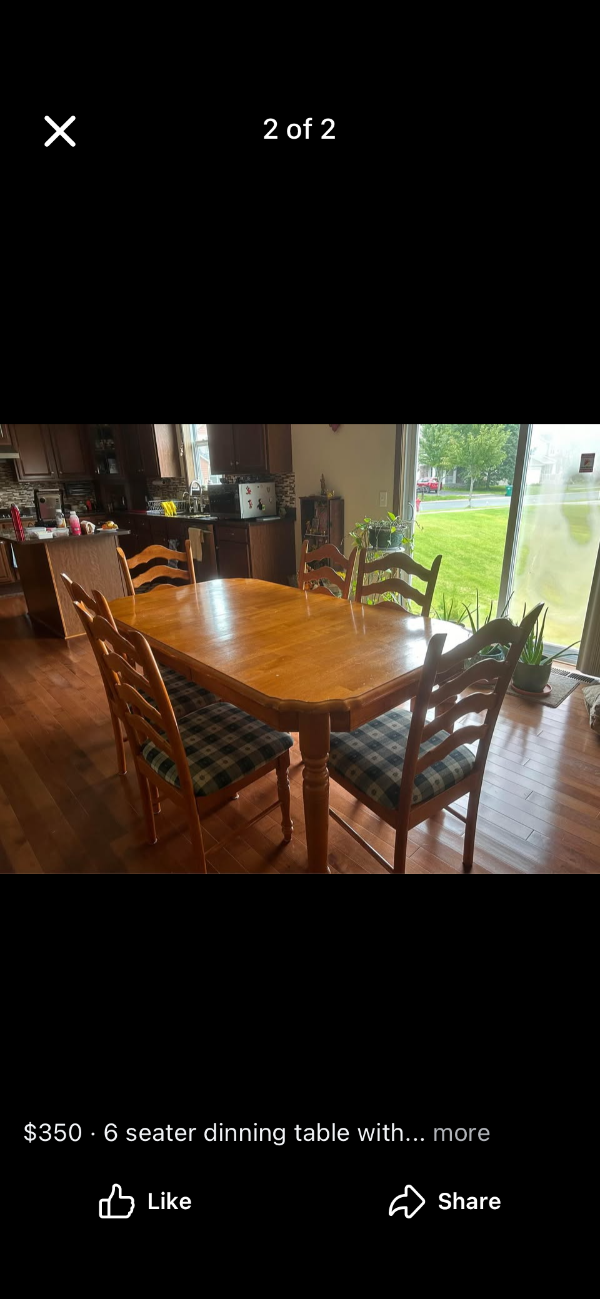 A 6 seater dinning table with chairs . The table converts to a 4 seater . Oak finish