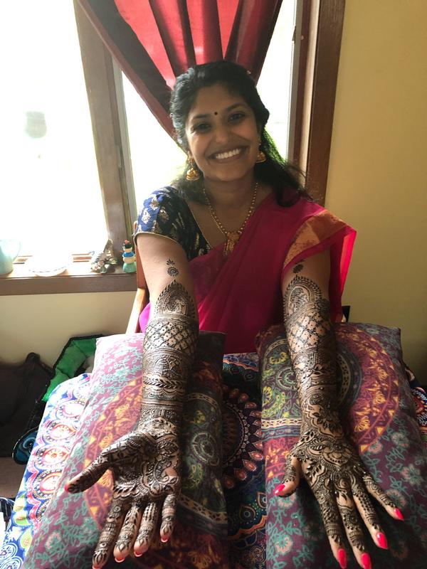 I have been trained in and practiced many forms of art for 20+ years, so deliver a very high quality design. Henna has been my sole business since 2009 I have been hired for brides, sangeets, wives celebrating Karwa Chauth and Eid, for Diwali celebrations, for expectant moms, for parties for girls and women, for individuals, for corporate events, and have done henna at IAM, SILC and Vibha events. I am a mom, homemaker and small business owner. I use only 100% natural henna paste that I make fresh myself with highest quality ingredients, which yields a very dark, gorgeous stain without harmful chemicals.